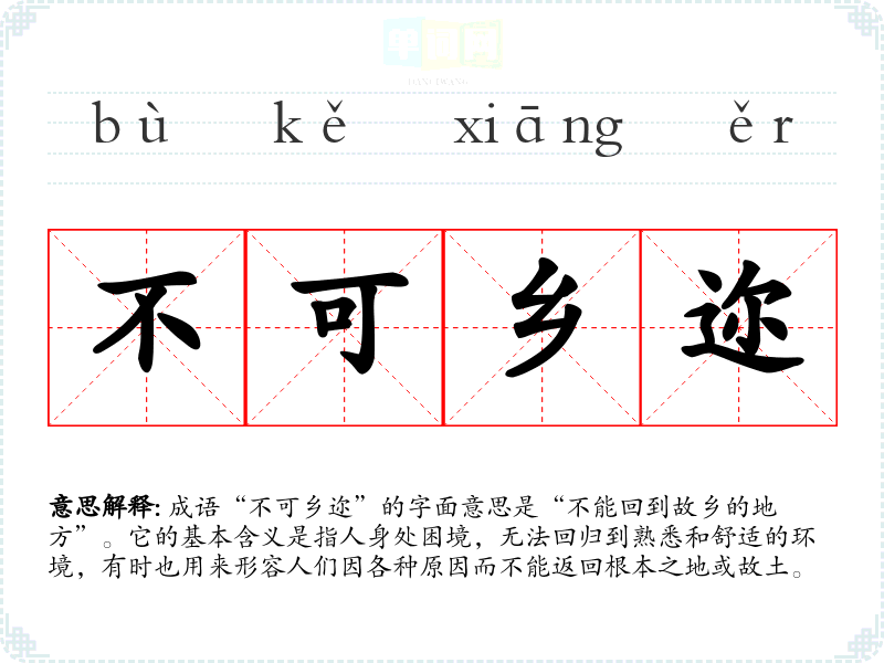 成语“不可乡迩”的字面意思是“不能回到故乡的地方”。它的基本含义是指人身处困境,无法回归到熟悉和舒适的环境,有时也用来形容人们因各种原因而不能返回根本之地或故土。