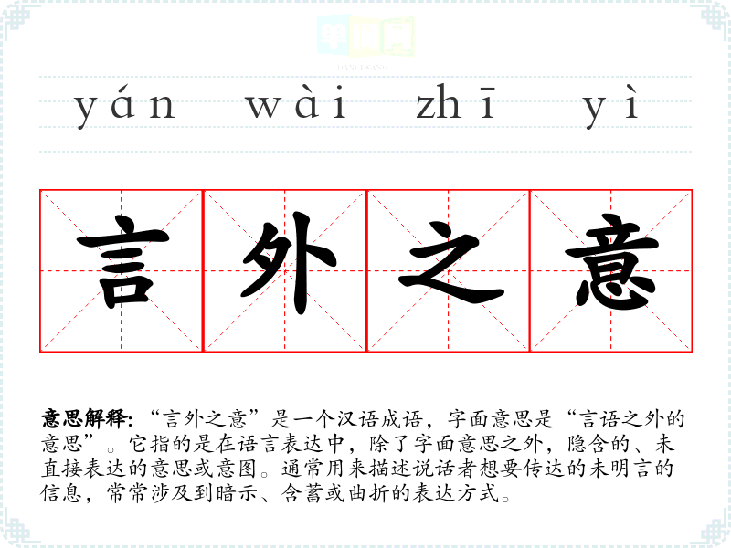 “言外之意”是一个汉语成语,字面意思是“言语之外的意思”。它指的是在语言表达中,除了字面意思之外,隐含的、未直接表达的意思或意图。通常用来描述说话者想要传达的未明言的信息,常常涉及到暗示、含蓄或曲折的表达方式。