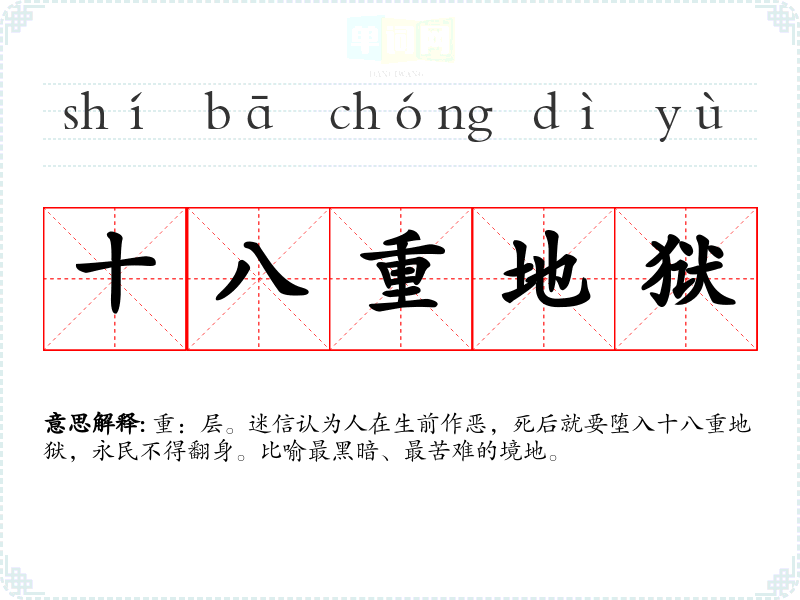 | 十八重地狱 | 重:层。迷信认为人在生前作恶,死后就要堕入十八重地狱,永民不得翻身。比喻最黑暗、最苦难的境地。 |