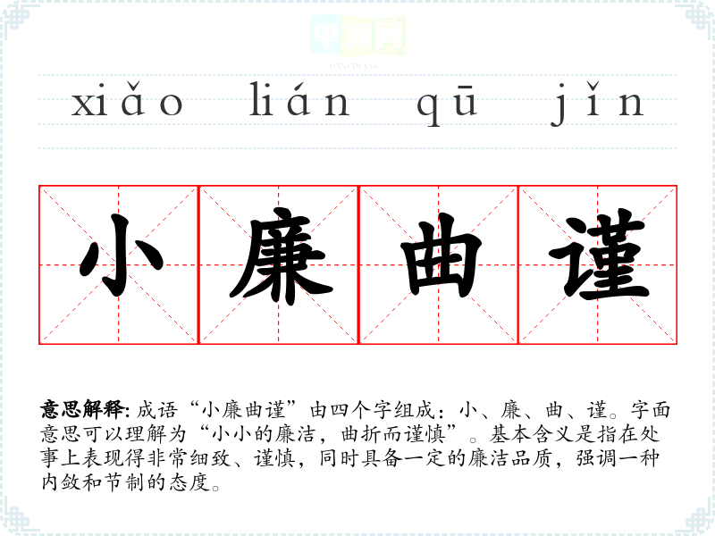 成语“小廉曲谨”由四个字组成:小、廉、曲、谨。字面意思可以理解为“小小的廉洁,曲折而谨慎”。基本含义是指在处事上表现得非常细致、谨慎,同时具备一定的廉洁品质,强调一种内敛和节制的态度。