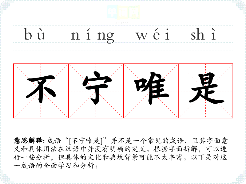 成语“[不宁唯是]”并不是一个常见的成语,且其字面意义和具体用法在汉语中并没有明确的定义。根据字面拆解,可以进行一些分析,但具体的文化和典故背景可能不太丰富。以下是对这一成语的全面学习和分析: