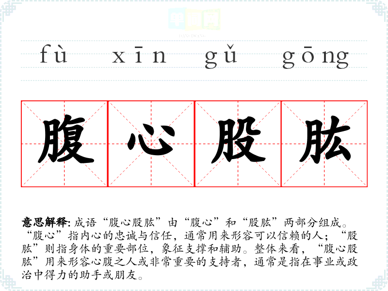 成语“腹心股肱”由“腹心”和“股肱”两部分组成。“腹心”指内心的忠诚与信任,通常用来形容可以信赖的人;“股肱”则指身体的重要部位,象征支撑和辅助。整体来看,“腹心股肱”用来形容心腹之人或非常重要的支持者,通常是指在事业或政治中得力的助手或朋友。