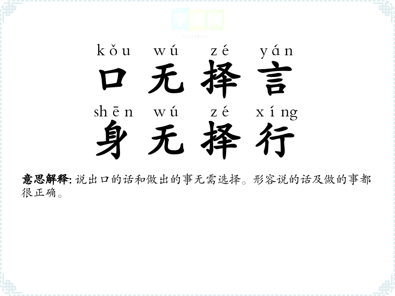 | 口无择言,身无择行 | 说出口的话和做出的事无需选择。形容说的话及做的事都很正确。 |