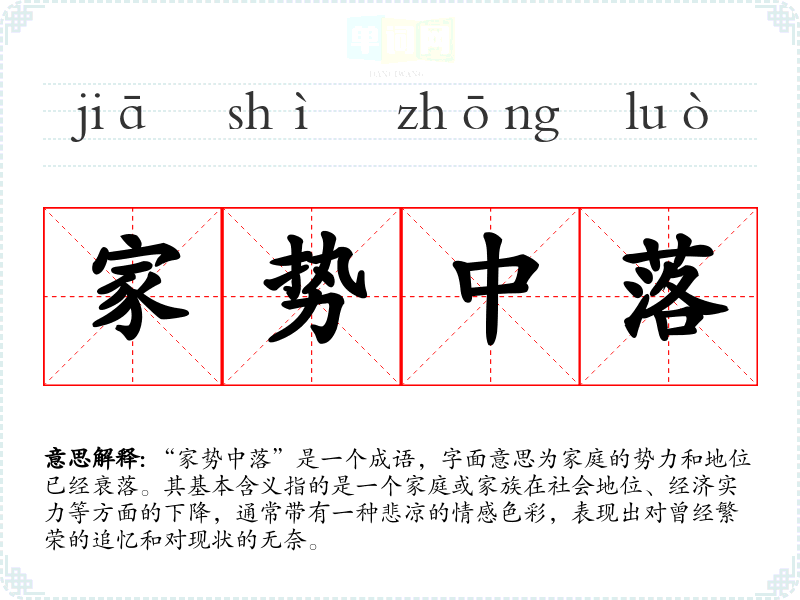“家势中落”是一个成语,字面意思为家庭的势力和地位已经衰落。其基本含义指的是一个家庭或家族在社会地位、经济实力等方面的下降,通常带有一种悲凉的情感色彩,表现出对曾经繁荣的追忆和对现状的无奈。