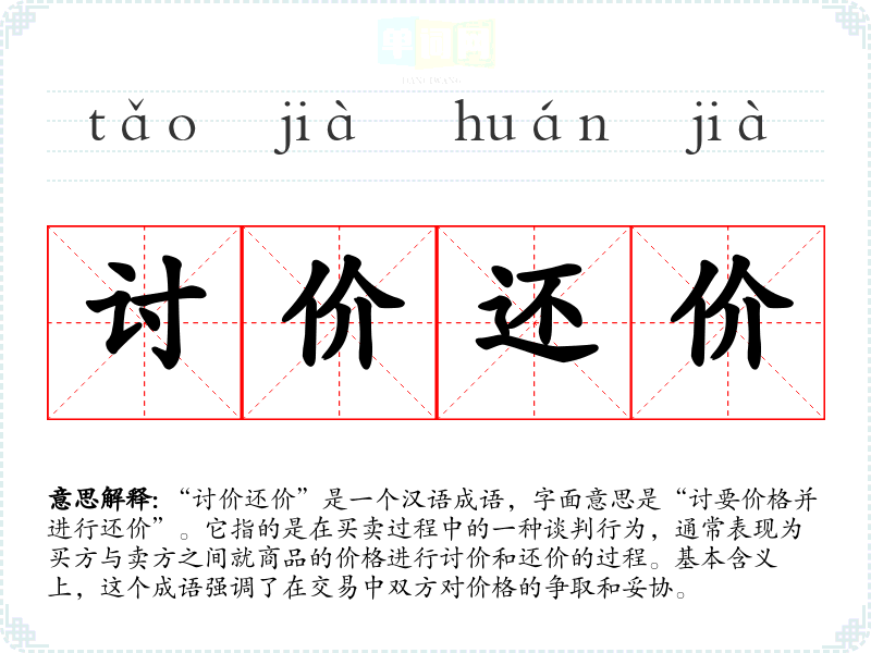 “讨价还价”是一个汉语成语,字面意思是“讨要价格并进行还价”。它指的是在买卖过程中的一种谈判行为,通常表现为买方与卖方之间就商品的价格进行讨价和还价的过程。基本含义上,这个成语强调了在交易中双方对价格的争取和妥协。
