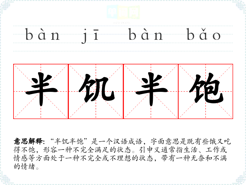 “半饥半饱”是一个汉语成语,字面意思是既有些饿又吃得不饱,形容一种不完全满足的状态。引申义通常指生活、工作或情感等方面处于一种不完全或不理想的状态,带有一种无奈和不满的情绪。