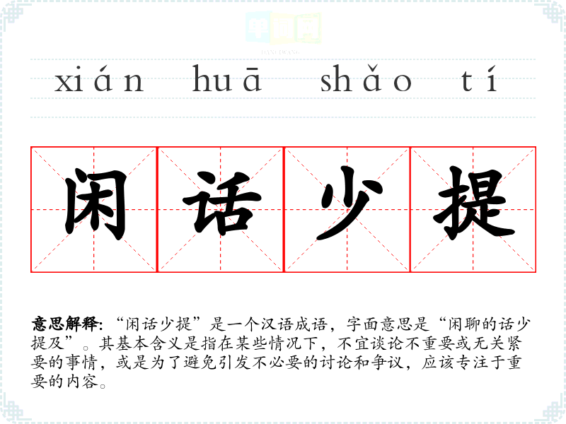 “闲话少提”是一个汉语成语,字面意思是“闲聊的话少提及”。其基本含义是指在某些情况下,不宜谈论不重要或无关紧要的事情,或是为了避免引发不必要的讨论和争议,应该专注于重要的内容。