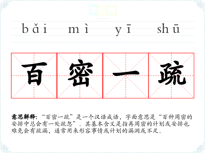 “百密一疏”是一个汉语成语,字面意思是“百种周密的安排中总会有一处疏忽”。其基本含义是指再周密的计划或安排也难免会有疏漏,通常用来形容事情或计划的漏洞或不足。