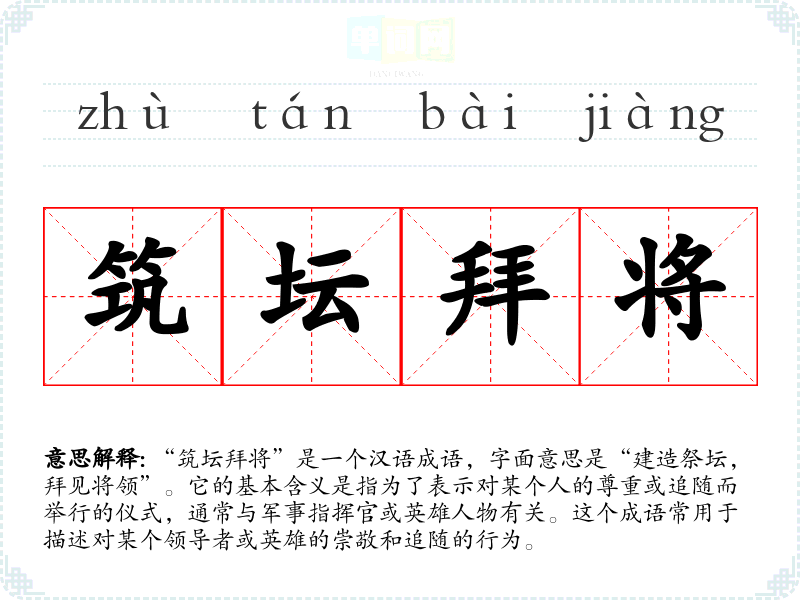 “筑坛拜将”是一个汉语成语,字面意思是“建造祭坛,拜见将领”。它的基本含义是指为了表示对某个人的尊重或追随而举行的仪式,通常与军事指挥官或英雄人物有关。这个成语常用于描述对某个领导者或英雄的崇敬和追随的行为。