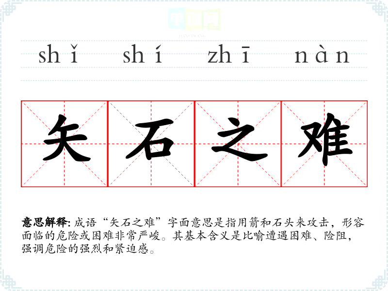 成语“矢石之难”字面意思是指用箭和石头来攻击,形容面临的危险或困难非常严峻。其基本含义是比喻遭遇困难、险阻,强调危险的强烈和紧迫感。