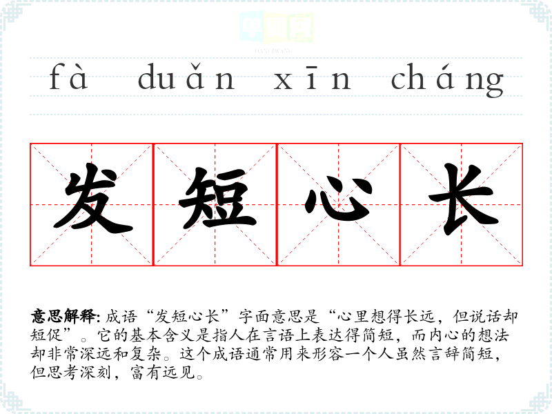 成语“发短心长”字面意思是“心里想得长远,但说话却短促”。它的基本含义是指人在言语上表达得简短,而内心的想法却非常深远和复杂。这个成语通常用来形容一个人虽然言辞简短,但思考深刻,富有远见。