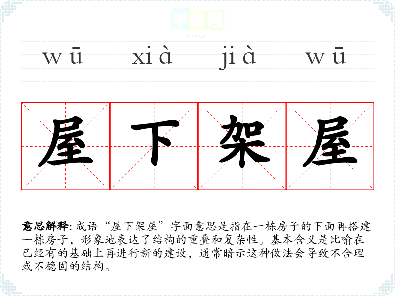 成语“屋下架屋”字面意思是指在一栋房子的下面再搭建一栋房子,形象地表达了结构的重叠和复杂性。基本含义是比喻在已经有的基础上再进行新的建设,通常暗示这种做法会导致不合理或不稳固的结构。