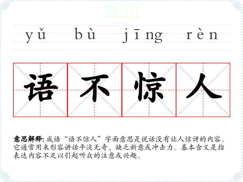 | 语不惊人 | 语:言语,也指文句。语句平淡,没有令人震惊的地方。 |