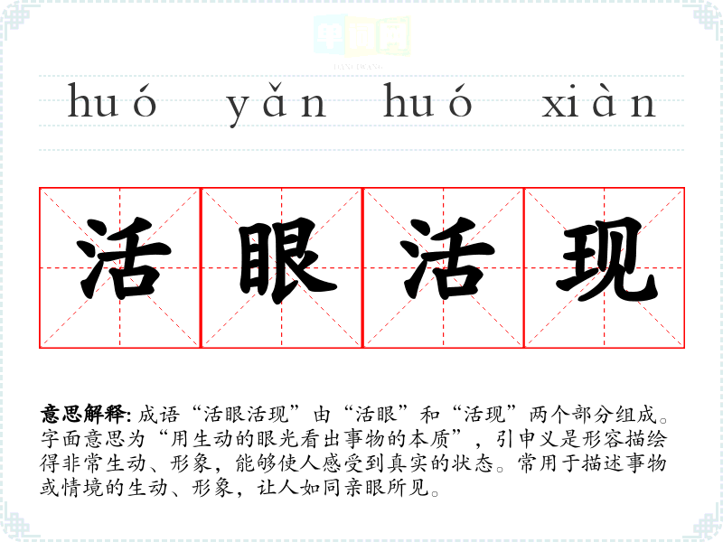 | 活眼活现 | 形容神情逼真,使人感到好像亲眼看到一般。同“活龙活现”。 |