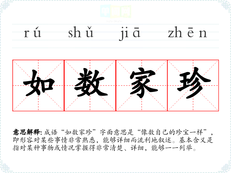成语“如数家珍”字面意思是“像数自己的珍宝一样”,即形容对某些事情非常熟悉,能够详细而流利地叙述。基本含义是指对某种事物或情况掌握得非常清楚、详细,能够一一列举。