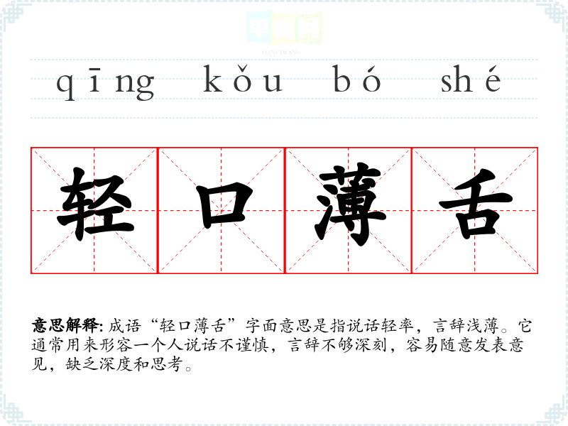 成语“轻口舌”字面意思是指说话轻率,言辞浅。它通常用来形容一个人说话不谨慎,言辞不够深刻,容易随意发表意见,缺乏深度和思考。