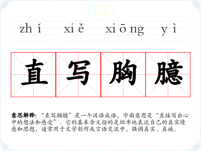 “直写胸臆”是一个汉语成语,字面意思是“直接写出心中的想法和感受”。它的基本含义指的是坦率地表达自己的真实情感和思想,通常用于文学创作或言语交流中,强调真实、真诚。