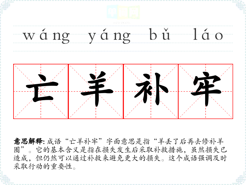 成语“亡羊补牢”字面意思是指“羊丢了后再去修补羊圈”。它的基本含义是指在损失发生后采取补救措施,虽然损失已造成,但仍然可以通过补救来避免更大的损失。这个成语强调及时采取行动的重要性。