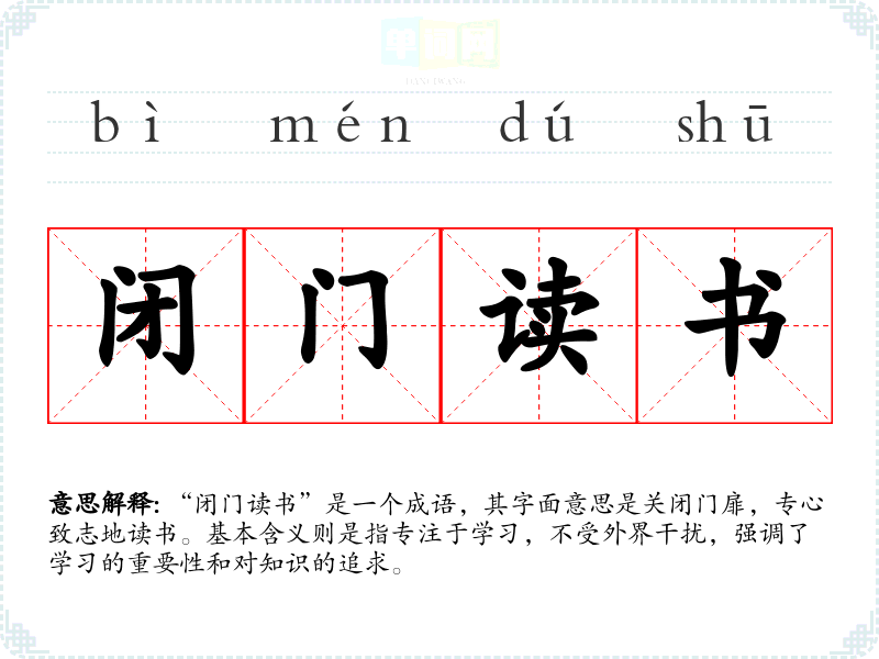 “闭门读书”是一个成语,其字面意思是关闭门扉,专心致志地读书。基本含义则是指专注于学,不受外界干扰,强调了学的重要性和对知识的追求。