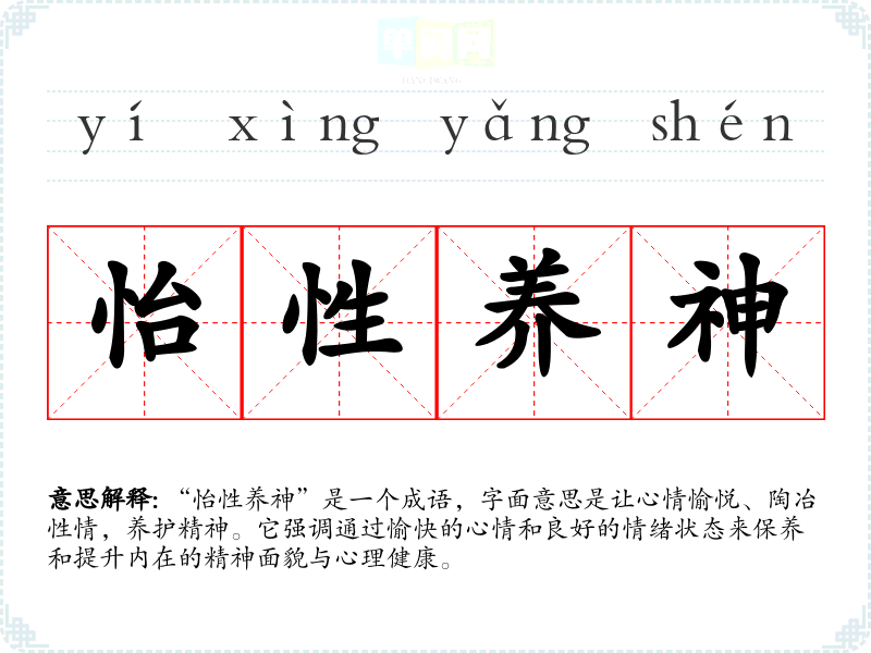 “怡性养神”是一个成语,字面意思是让心情愉悦、陶冶性情,养护精神。它强调通过愉快的心情和良好的情绪状态来保养和提升内在的精神面貌与心理健康。