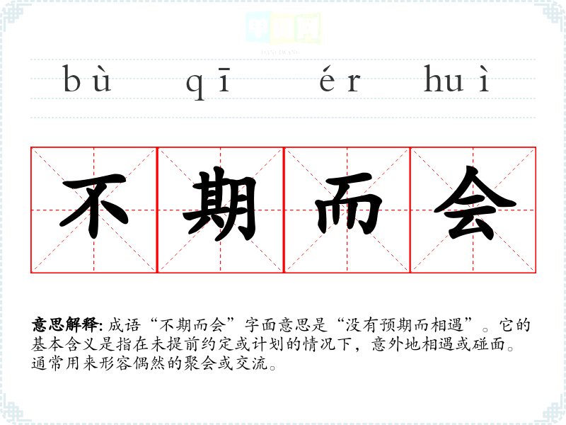 成语“不期而会”字面意思是“没有预期而相遇”。它的基本含义是指在未提前约定或计划的情况下,意外地相遇或碰面。通常用来形容偶然的聚会或交流。