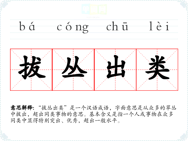 “拔丛出类”是一个汉语成语,字面意思是从众多的草丛中拔出,超出同类事物的意思。基本含义是指一个人或事物在众多同类中显得特别突出、优秀,超出一般水平。