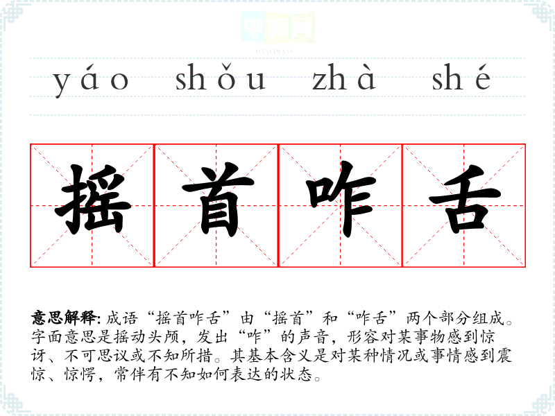 成语“摇首咋舌”由“摇首”和“咋舌”两个部分组成。字面意思是摇动头颅,发出“咋”的声音,形容对某事物感到惊讶、不可思议或不知所措。其基本含义是对某种情况或事情感到震惊、惊愕,常伴有不知如何表达的状态。