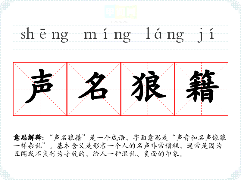 “声名狼籍”是一个成语,字面意思是“声音和名声像狼一样杂乱”。基本含义是形容一个人的名声非常糟糕,通常是因为丑闻或不良行为导致的,给人一种混乱、负面的印象。