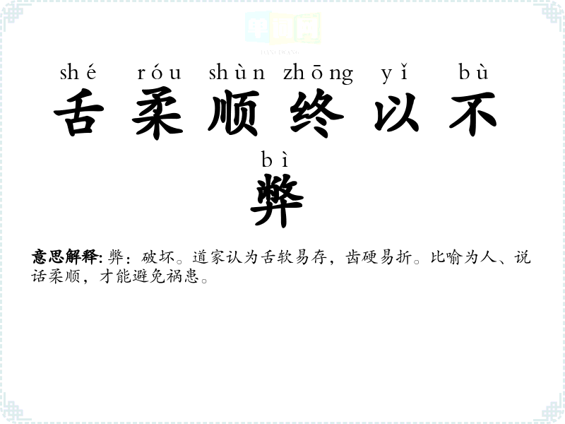 | 舌柔顺终以不弊 | 弊:破坏。道家认为舌软易存,齿硬易折。比喻为人、说话柔顺,才能避免祸患。 |