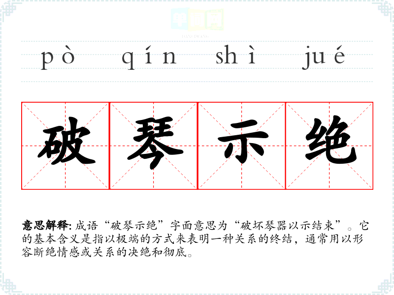 成语“破琴示绝”字面意思为“破坏琴器以示结束”。它的基本含义是指以极端的方式来表明一种关系的终结,通常用以形容断绝情感或关系的决绝和彻底。
