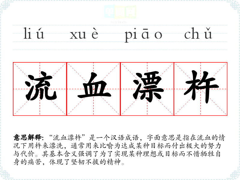 “流血漂杵”是一个汉语成语,字面意思是指在流血的情况下用杵来漂洗,通常用来比喻为达成某种目标而付出极大的努力与代价。其基本含义强调了为了实现某种理想或目标而不惜牺牲自身的痛苦,体现了坚韧不拔的精神。