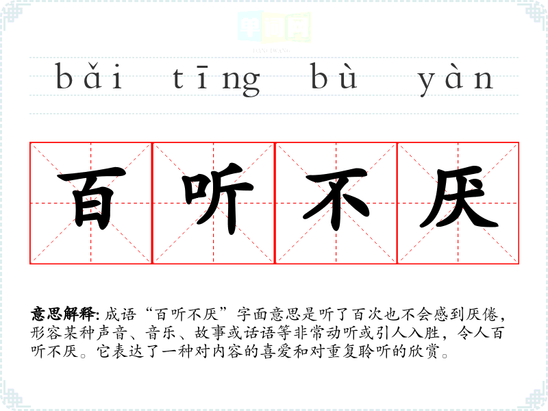 “百听不厌”源于古代文学,最早可以追溯到《后汉书·冯异传》中提到的“常听之而不厌”,后被后人简化为“百听不厌”。它体现了古人对美好事物的追求和对艺术的热爱。