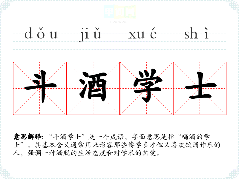 “斗酒学士”是一个成语,字面意思是指“喝酒的学士”。其基本含义通常用来形容那些博学多才但又喜欢饮酒作乐的人,强调一种洒脱的生活态度和对学术的热爱。