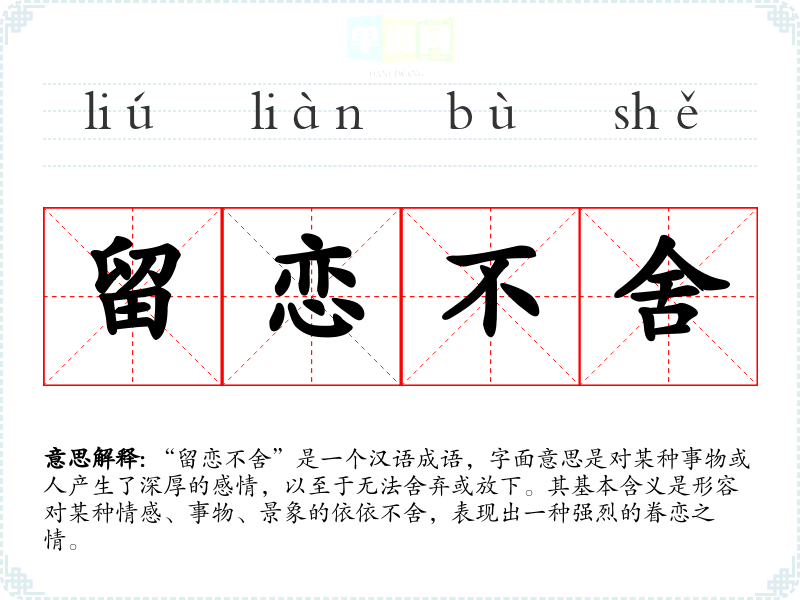 | 恋恋不舍 | 恋恋:爱慕,留恋。原形容极其爱慕,不能丢开。现多形容非常留恋,舍不得离开。 |