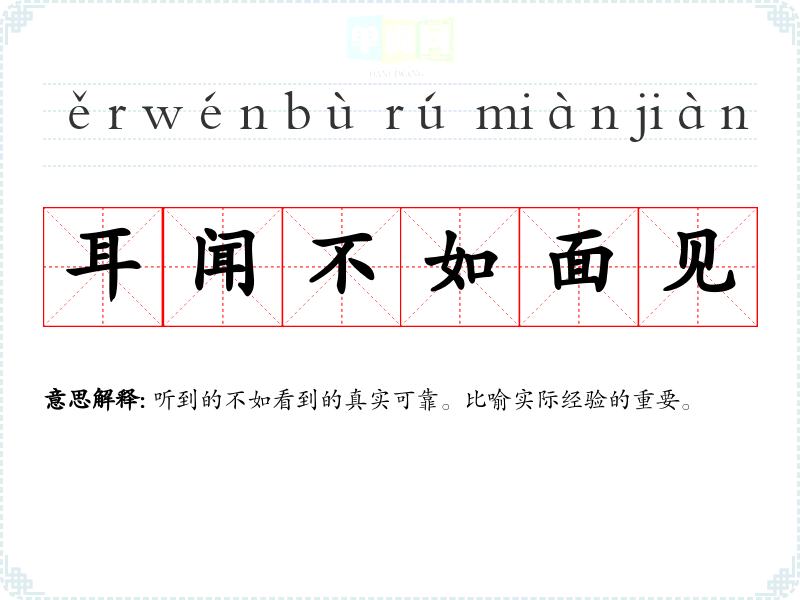 | 耳听是虚,眼见为实 | 虚:虚假。听到的不足信,亲眼看到的才真实可靠。 |