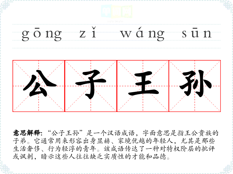 “公子王孙”是一个汉语成语,字面意思是指王公贵族的子弟。它通常用来形容出身显赫、家境优越的年轻人,尤其是那些生活奢侈、行为轻浮的青年。该成语传达了一种对特权阶层的批评或讽刺,暗示这些人往往缺乏实质性的才能和品德。