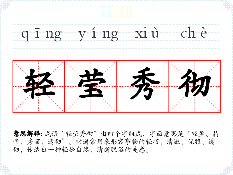 成语“轻莹秀彻”由四个字组成,字面意思是“轻盈、晶莹、秀丽、透彻”。它通常用来形容事物的轻巧、清澈、优雅、透彻,传达出一种轻松自然、清新脱俗的美感。
