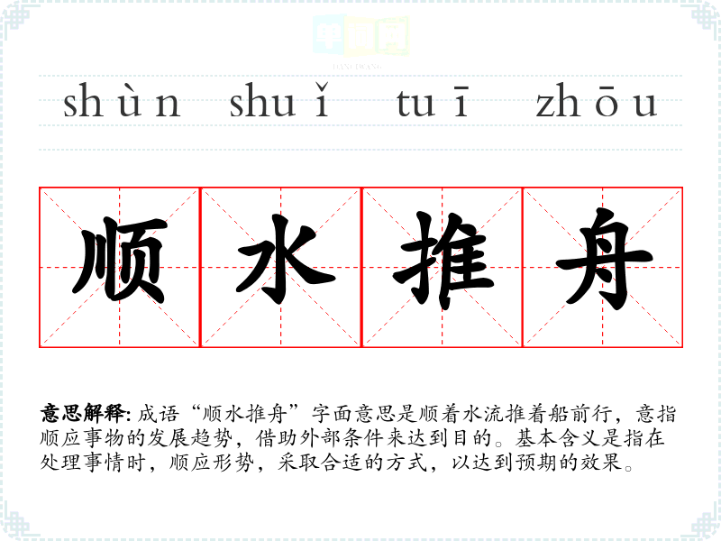 成语“顺水推舟”字面意思是顺着水流推着船前行,意指顺应事物的发展趋势,借助外部条件来达到目的。基本含义是指在处理事情时,顺应形势,采取合适的方式,以达到预期的效果。