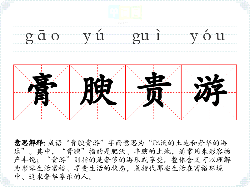 成语“膏腴贵游”字面意思为“肥沃的土地和奢华的游乐”。其中,“膏腴”指的是肥沃、丰腴的土地,通常用来形容物产丰饶;“贵游”则指的是奢侈的游乐或享受。整体含义可以理解为形容生活富裕、享受生活的状态,或指代那些生活在富裕环境中、追求奢华享乐的人。
