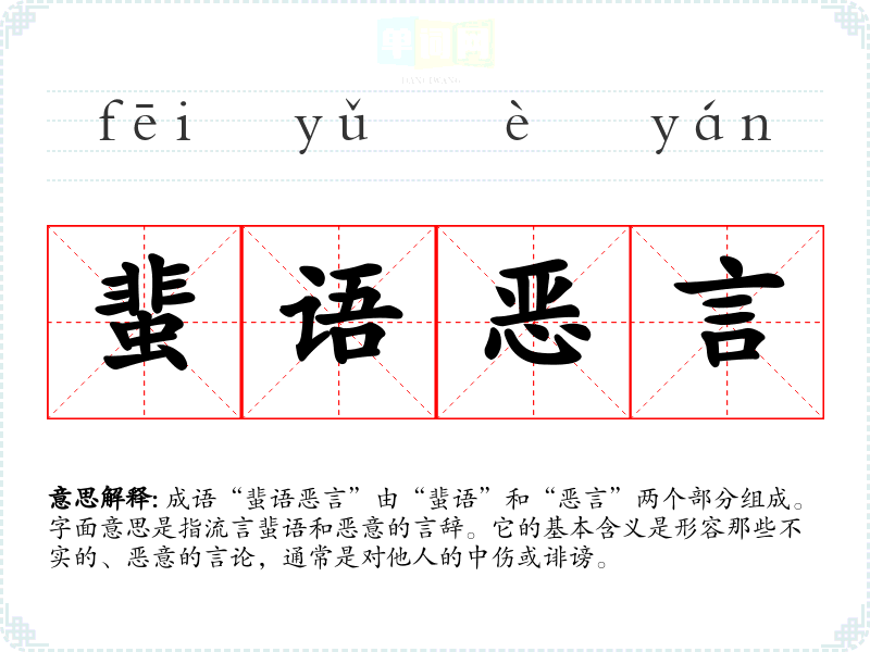 成语“蜚语恶言”由“蜚语”和“恶言”两个部分组成。字面意思是指流言蜚语和恶意的言辞。它的基本含义是形容那些不实的、恶意的言论,通常是对他人的中伤或诽谤。