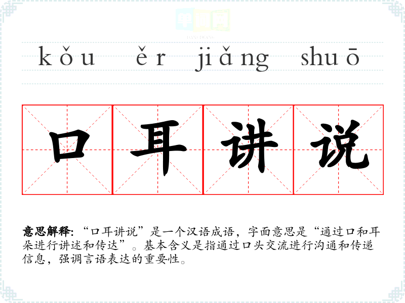 “口耳讲说”并没有明确的历史典故或文学出处,它的构成主要是汉字的组合,反映了传统文化中对口头交流的重视。在**古代,由于文字传播的局限,口耳相传是信息传播的重要方式,因此这一成语也体现了这一文化现象。