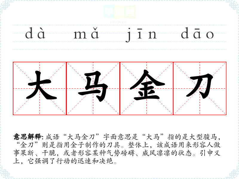 成语“大马金刀”字面意思是“大马”指的是大型骏马,“金刀”则是指用金子制作的刀具。整体上,该成语用来形容人做事果断、干脆,或者形容某种气势磅礴、威风凛凛的状态。引申义上,它强调了行动的迅速和决绝。