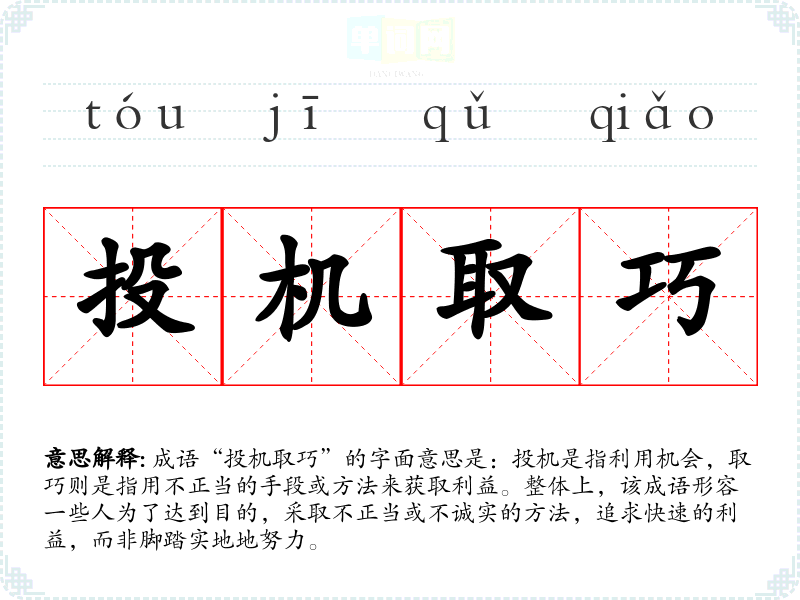 成语“投机取巧”的字面意思是:投机是指利用机会,取巧则是指用不正当的手段或方法来获取利益。整体上,该成语形容一些人为了达到目的,采取不正当或不诚实的方法,追求快速的利益,而非脚踏实地地努力。