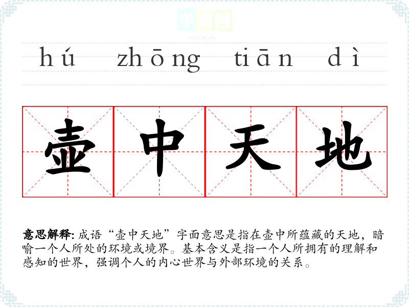 成语“壶中天地”字面意思是指在壶中所蕴藏的天地,暗喻一个人所处的环境或境界。基本含义是指一个人所拥有的理解和感知的世界,强调个人的内心世界与外部环境的关系。