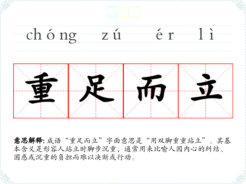成语“重足而立”字面意思是“用双脚重重站立”。其基本含义是形容人站立时脚步沉重,通常用来比喻人因内心的纠结、困惑或沉重的负担而难以决断或行动。