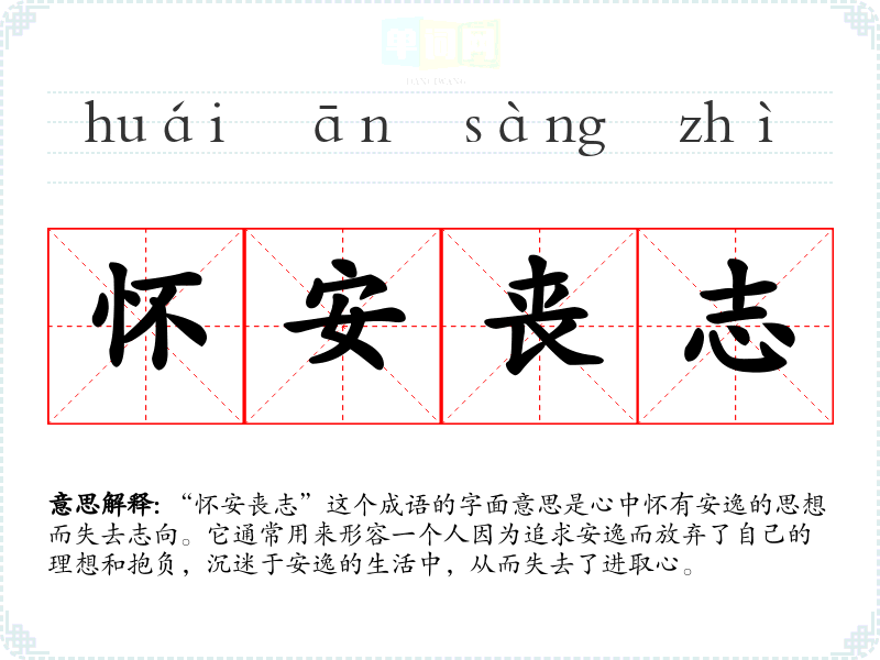 “怀安丧志”这个成语的字面意思是心中怀有安逸的思想而失去志向。它通常用来形容一个人因为追求安逸而放弃了自己的理想和抱负,沉迷于安逸的生活中,从而失去了进取心。