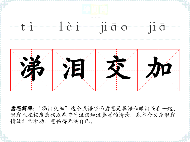 “涕泪交加”这个成语字面意思是鼻涕和眼泪混在一起,形容人在极度悲伤或痛苦时流泪和流鼻涕的情景。基本含义是形容情绪非常激动,悲伤得无法自已。