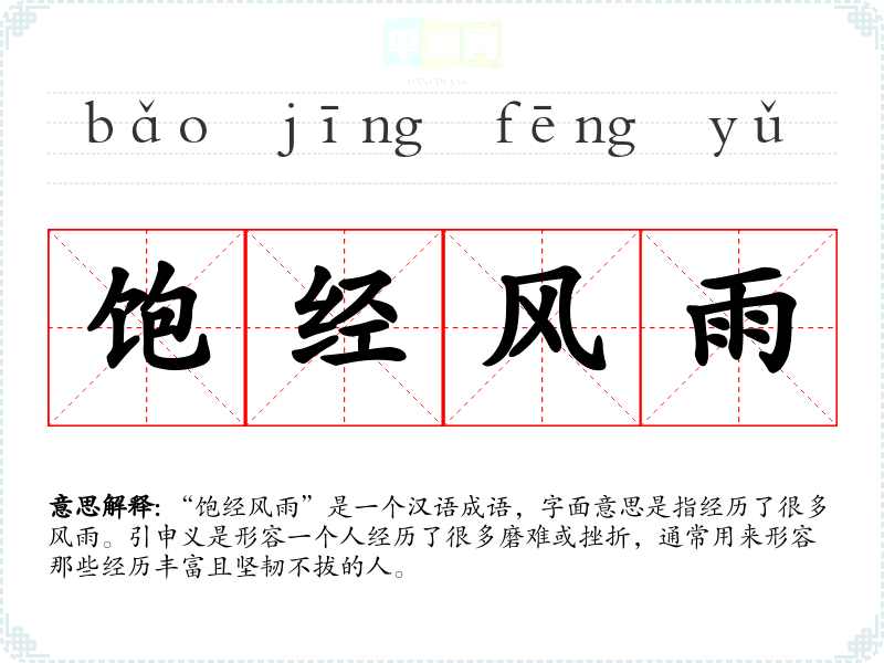 “饱经风雨”是一个汉语成语,字面意思是指经历了很多风雨。引申义是形容一个人经历了很多磨难或挫折,通常用来形容那些经历丰富且坚韧不拔的人。