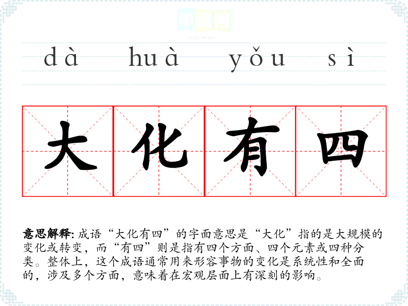 通过对“大化有四”的学,我理解到变化的复杂性与多样性是我们生活中不可或缺的一部分。它不仅影响我们的思维方式,还影响我们的语言表达和沟通方式。在语言学中,理解这样的成语有助于我们更全面地表达自己的观点和情感。