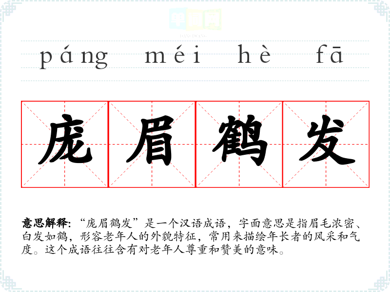 - 同义成语:白发苍苍、老态龙钟。这些成语都表达了老年人的外貌特征和状态,但“庞眉鹤发”更强调气质。